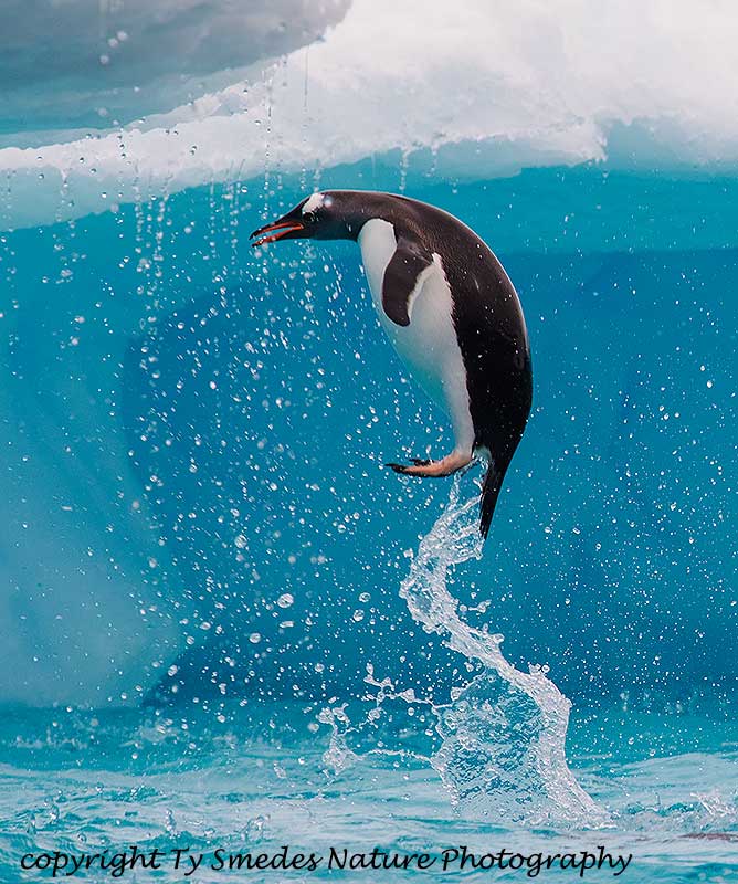 Gentoo Penguin leaping onto grounded Iceberg, Danco Island, Antarctic Peninsula